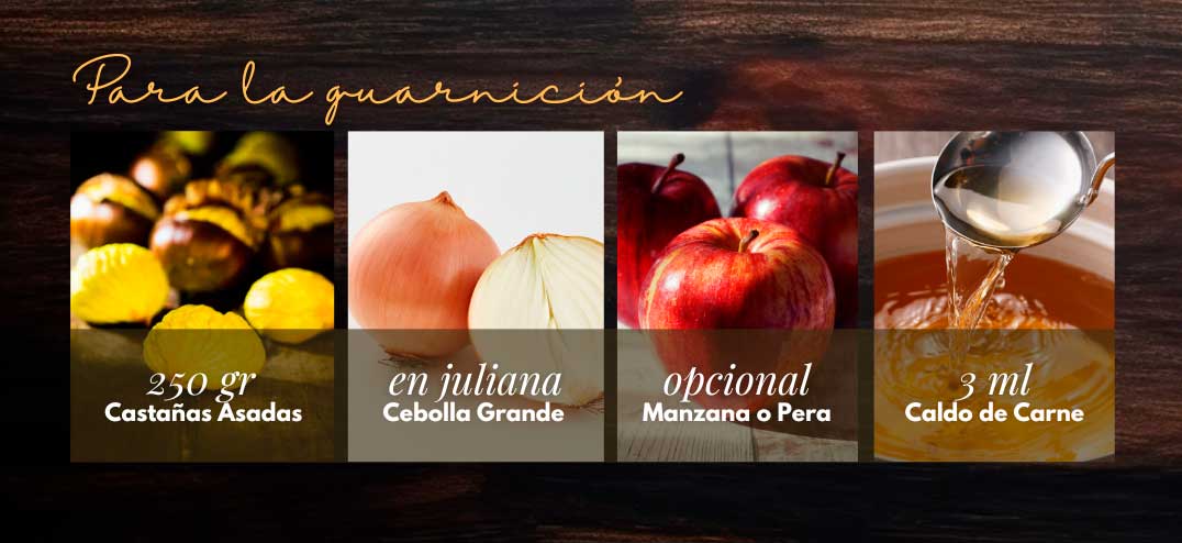 En una bandeja de horno, pica toda la guarnición como más te guste (en juliana, a taquitos pequeñitos…). Las castañas déjalas enteras (recuerda que ya están asadas o cocidas). Añade un buen chorrito de caldo y coloca la presa encima como protagonista absoluta.